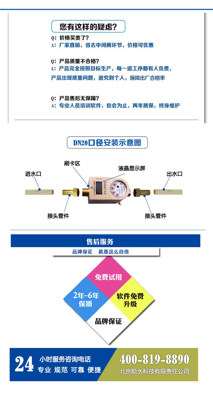 4、显示功能:液晶可查看购水量、剩余水量、累计用水量、阀门状态、电池状态等多项数据;